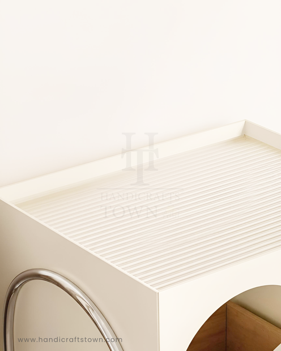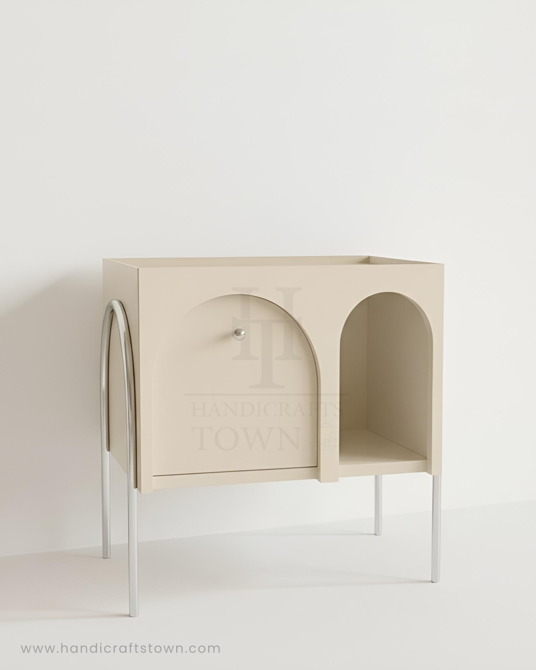 Inspired by classical Roman forms and streamlined mid-century design, the Arco Nightstand transforms your bedside. Its architectural silhouette features a creamy, matte-finish body with two graceful open arches. One arch houses a deep, smooth-gliding drawer, subtly faced to blend into the design, providing discreet storage. The contrasting tubular chrome frame and delicate slatted top add a contemporary edge, ensuring this piece feels as luxurious as it is practical. A true statement of refined taste.