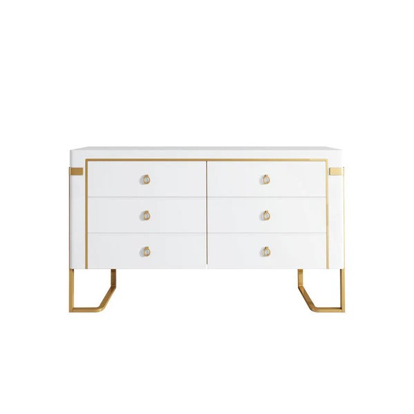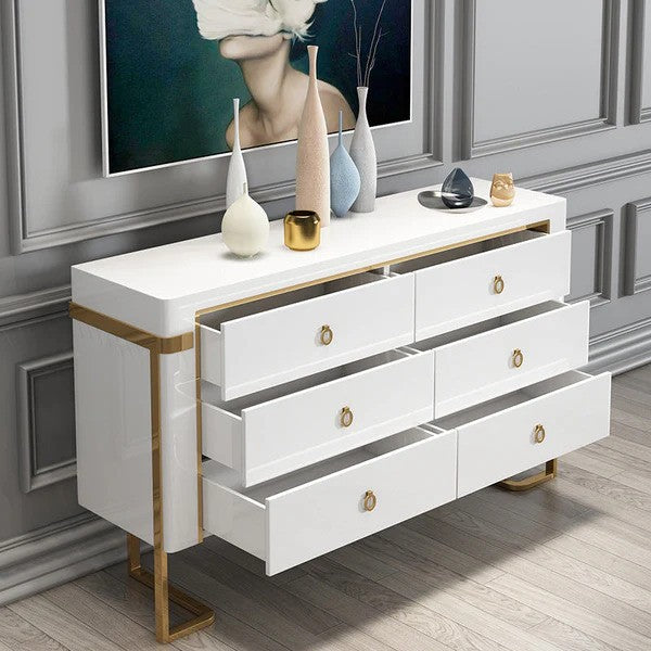 The Aurum & Ivory Sideboard Cabinet is a stylish and practical storage solution for your dining or kitchen area. Crafted from sturdy wooden MDF and finished in a smooth white PU, this cabinet offers a clean and elegant look. The addition of golden molding along the top and bottom edges brings a touch of luxurious detail, creating a versatile and gorgeous aesthetic. It features six spacious drawers, providing ample room to neatly organize your cutlery and kitchen accessories. The cabinet is elevated by a durable stainless steel stand, adding a modern touch and ensuring stability. This sideboard seamlessly blends functionality with sophisticated design, making it a beautiful and useful addition to your home.
