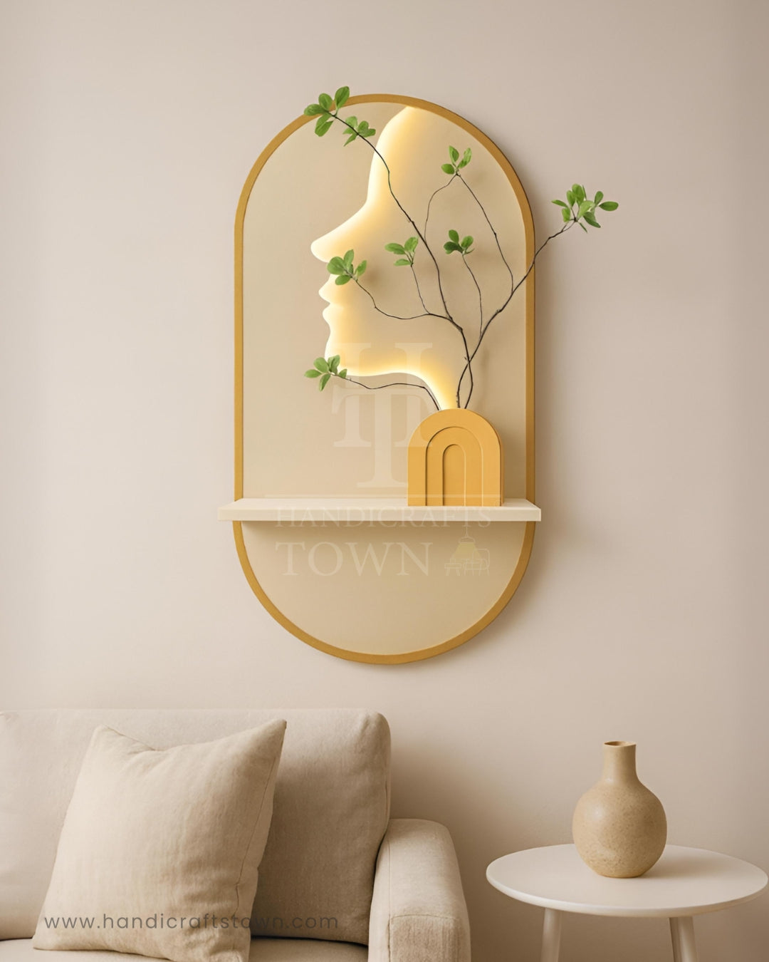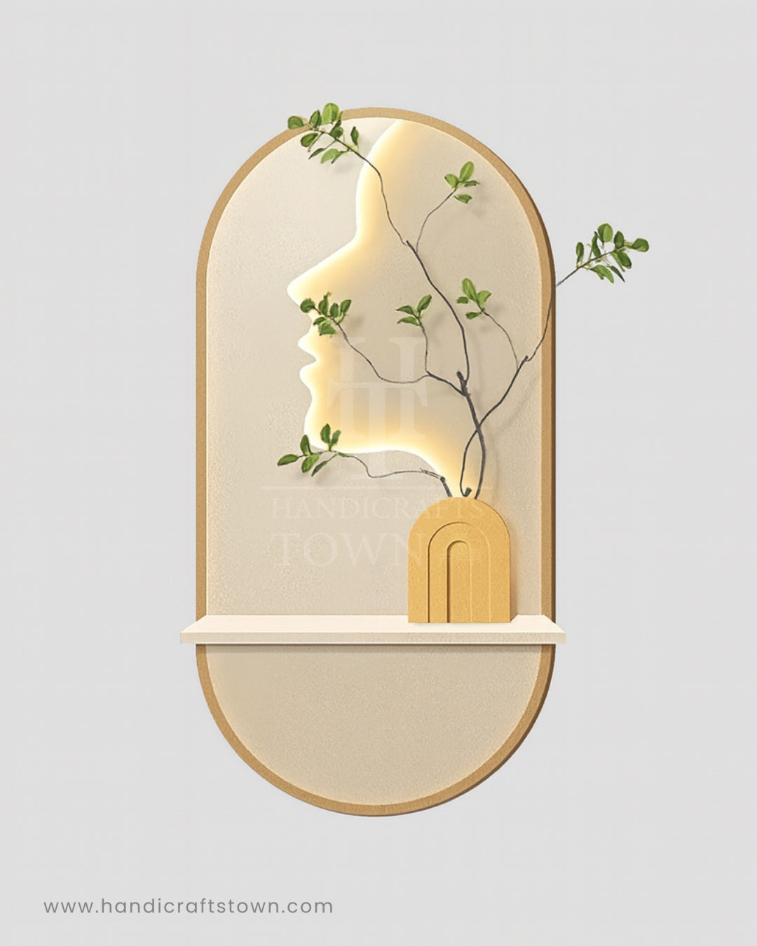 Flora Face Wall Art brings together modern artistry and natural elegance. Designed with a glowing silhouette profile, it creates a serene focal point while delicate green branches extend organically through the form. The arched wooden frame and soft lighting add warmth, making it a perfect blend of contemporary design and nature-inspired charm. Ideal for living rooms, bedrooms, or creative spaces, this piece symbolizes harmony between human essence and the beauty of growth.