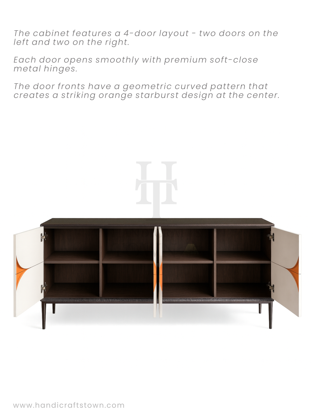 The Modora Prism Cabinet is a statement piece designed for modern spaces that appreciate geometric artistry and refined craftsmanship. Featuring a bold prism-inspired motif on its front panels, this cabinet blends sleek minimalism with a touch of sculptural elegance.