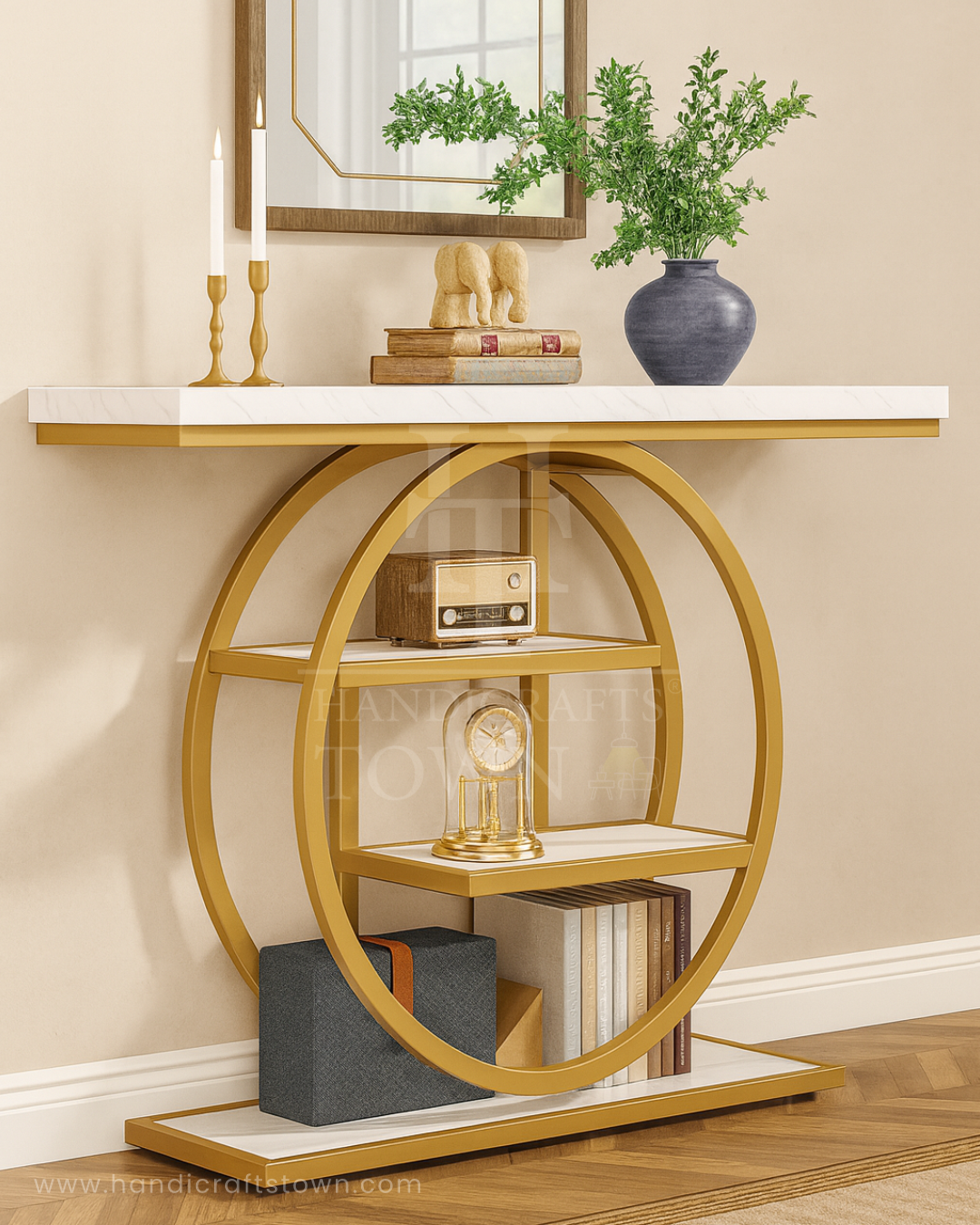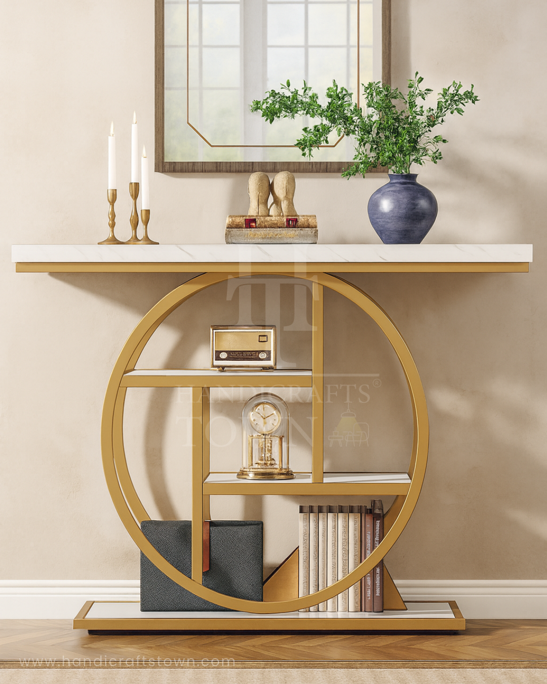 The Orbitra Console Table by Handicrafts Town, crafted with a striking circular gold metal frame and a pristine marble-finish top, this piece blends modern artistry with functional design. The open shelving offers ample space for décor, books, and essentials, while the bold geometric silhouette makes it a captivating focal point in any room. Perfect for entryways, living rooms, or hallways, Orbitra adds a touch of luxury to every corner it graces.