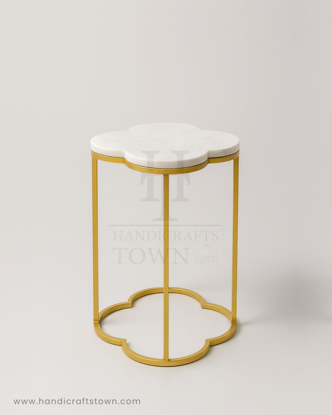 Elevate your living space with the artistic elegance of the QuadraBloom End Table. Inspired by the soft geometry of a four-petal bloom, this piece combines a sculpted marble top with a gleaming golden frame for a statement of timeless luxury.