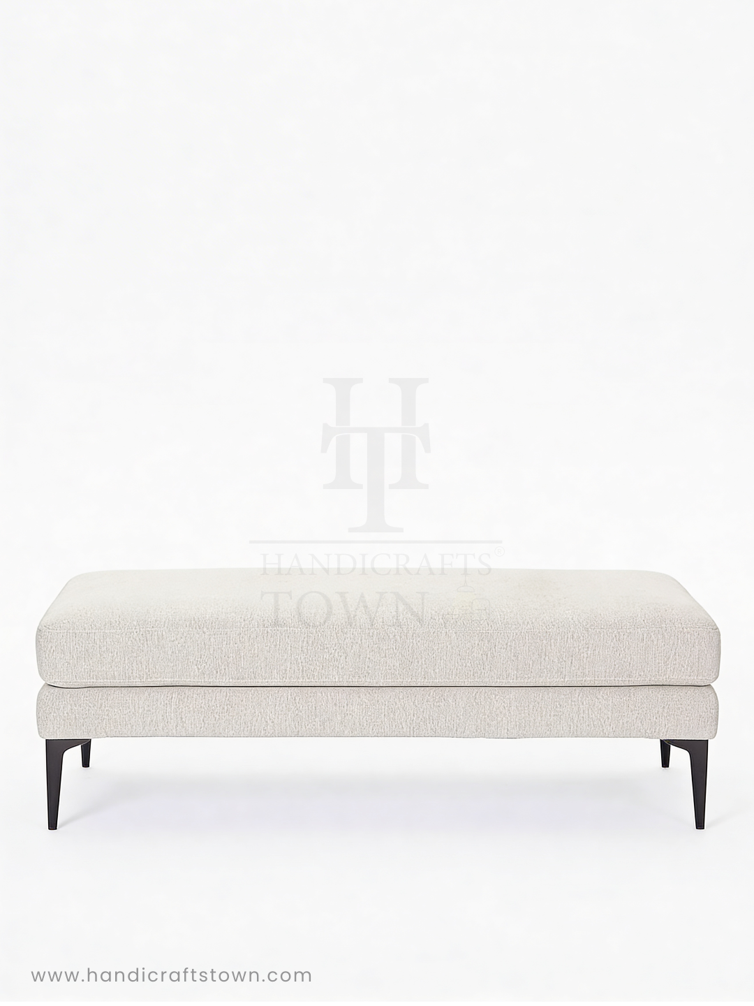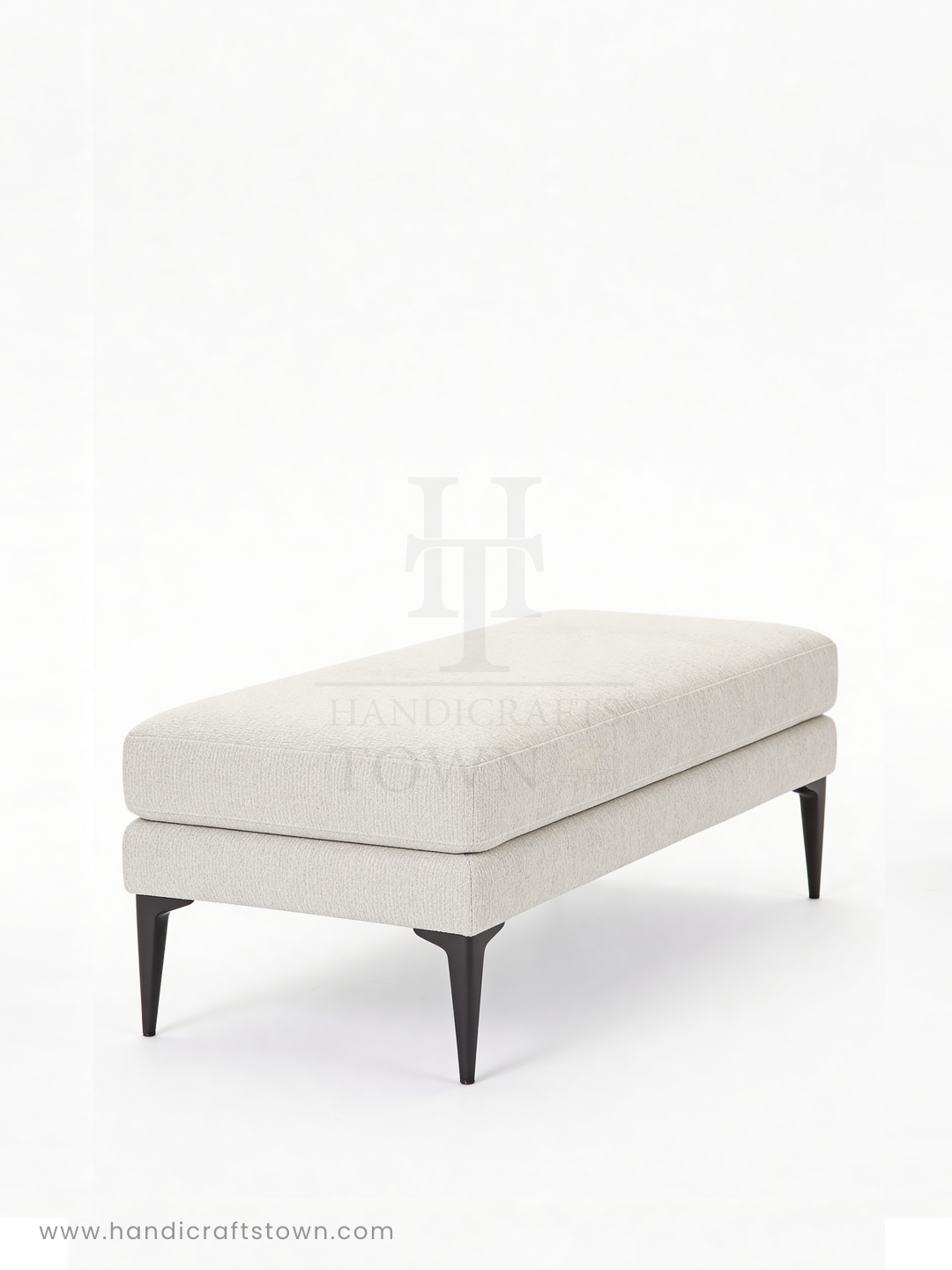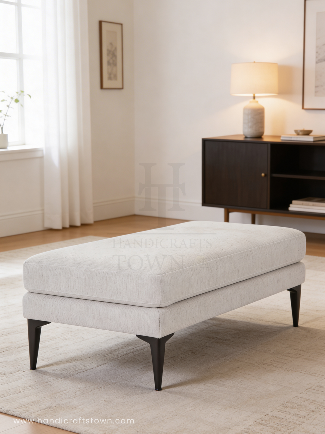 The Retro-Mod Bench is a celebration of negative space and textural contrast. By utilizing a "floating" double-cushion silhouette, this piece achieves a rare sense of lightness despite its generous seating area. The slub-weave fabric provides a rhythmic, organic texture that softens the sharp, architectural lines of the obsidian-stained legs.