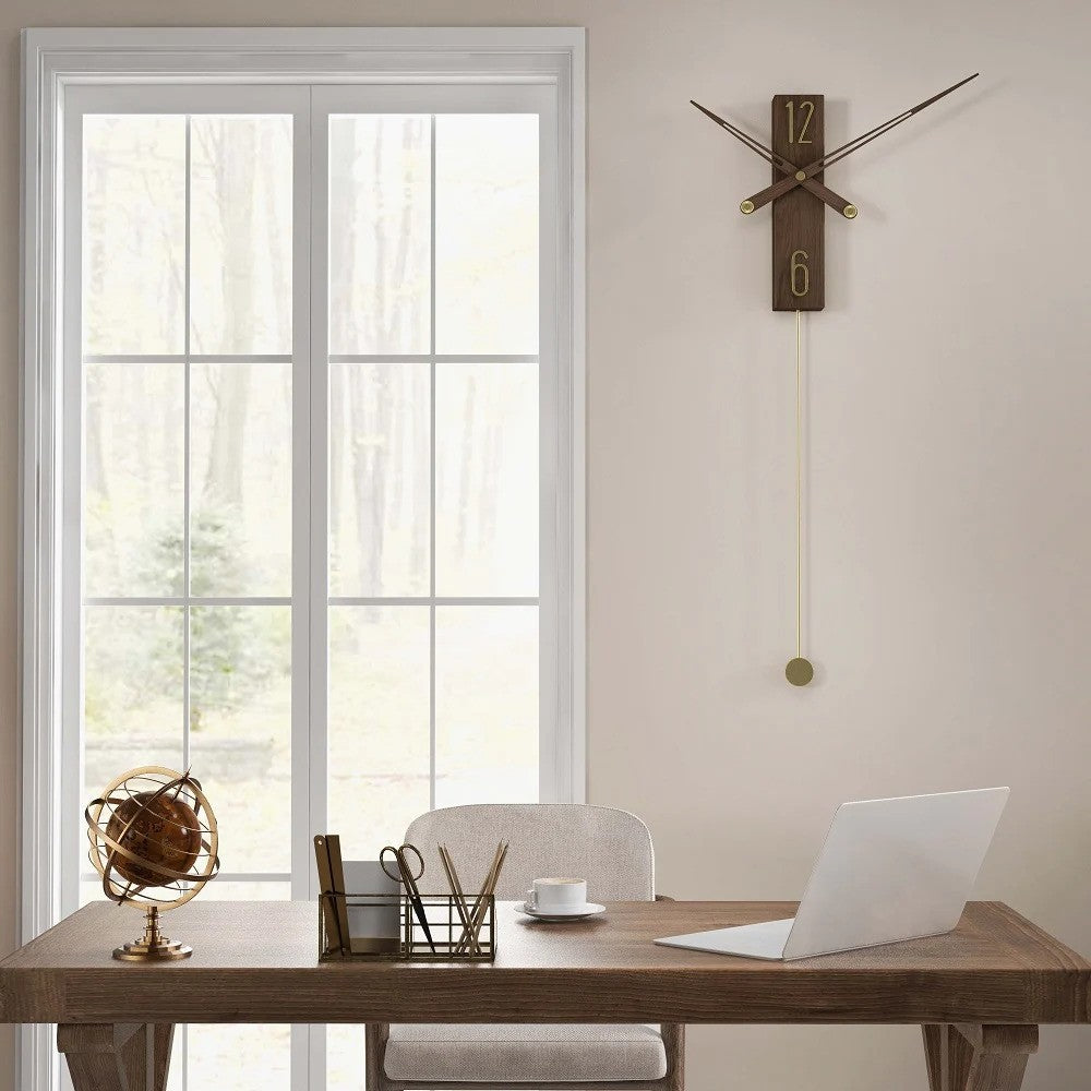 Elevate your living space with the Bar Wall Clock, a timepiece that blends timeless design with modern simplicity. Crafted from a single, solid piece of walnut-hued wood, its elegant brick-like form is a testament to minimalist beauty. A sleek iron pendulum in a striking gold finish hangs below, creating a captivating visual rhythm that adds a touch of sophistication to any room. The same refined brass is used for the hands and numbers, providing a subtle yet stunning contrast against the rich wood.