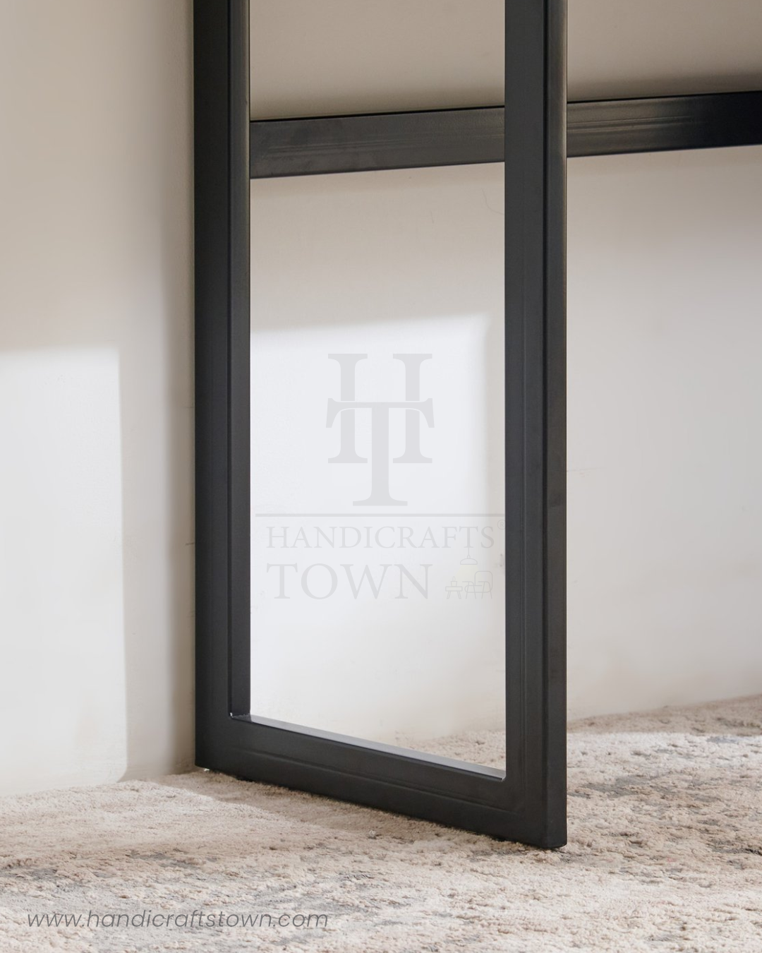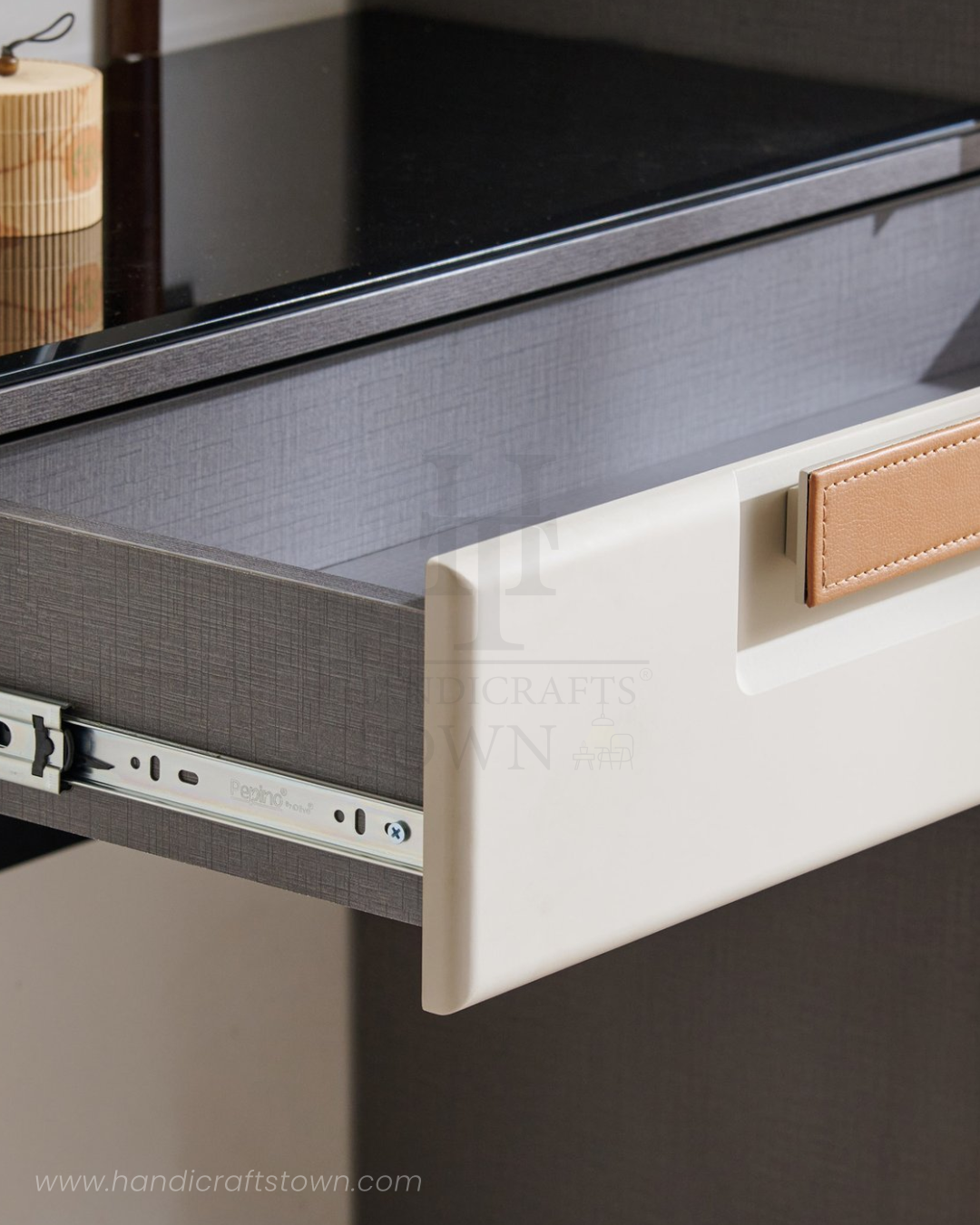 The Beckett Station is more than a dressing table; it is a masterclass in modern geometry and tactile luxury. Designed for those who appreciate a structured start to their day, this vanity blends the industrial cool of matte black steel with the organic warmth of hand-stitched leather accents and cream-toned paneling. The Beckett Station balances a spacious, high-gloss work surface with an integrated glass-front display tower. The contrast of the deep charcoal wood grain against the soft cream drawers creates a visual depth that commands attention in any bedroom or dressing suite.