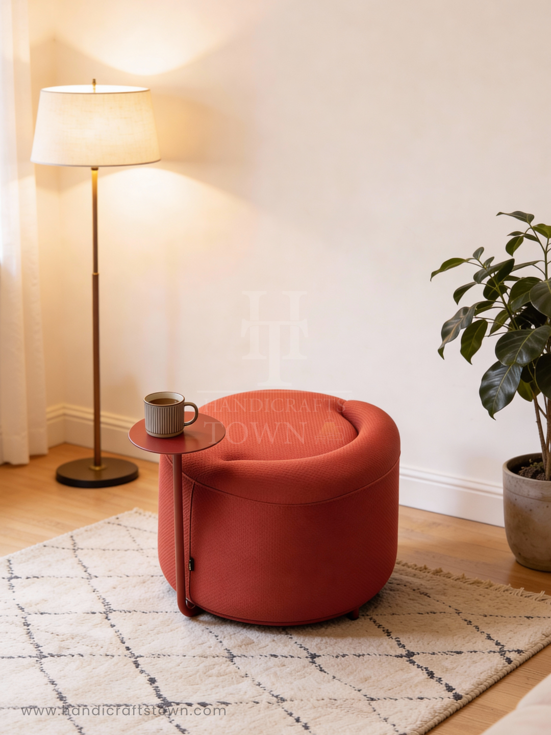 Elevate your lounging experience with a piece that works twice as hard. The Solis Ottoman is a masterclass in organic modern design. Featuring a unique "nest" silhouette and a stunning terracotta hue, it brings a warm, sun-drenched energy to any room. But the Solis isn't just a footrest or a spare seat—it’s a complete relaxation station, featuring a seamlessly integrated side table that keeps your coffee, tech, or books within arm's reach.