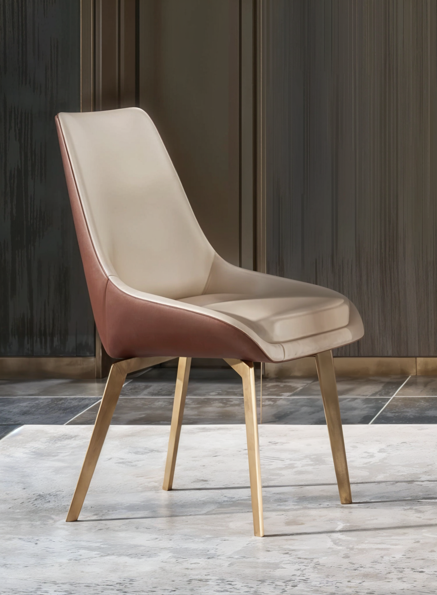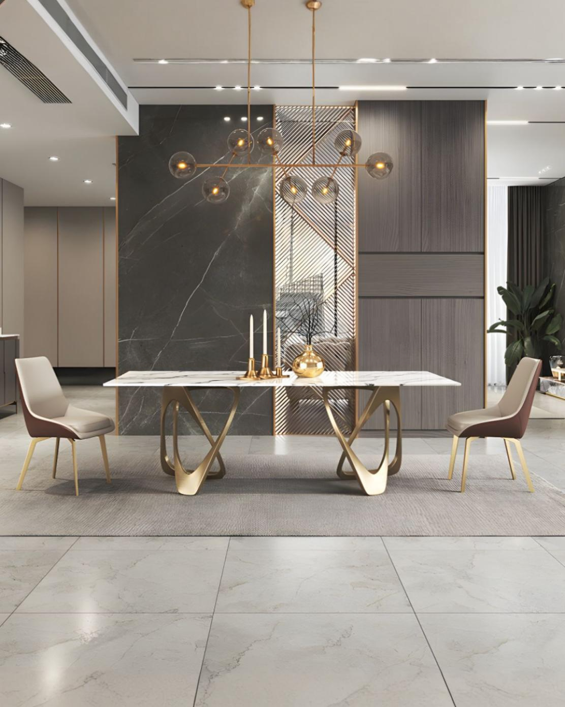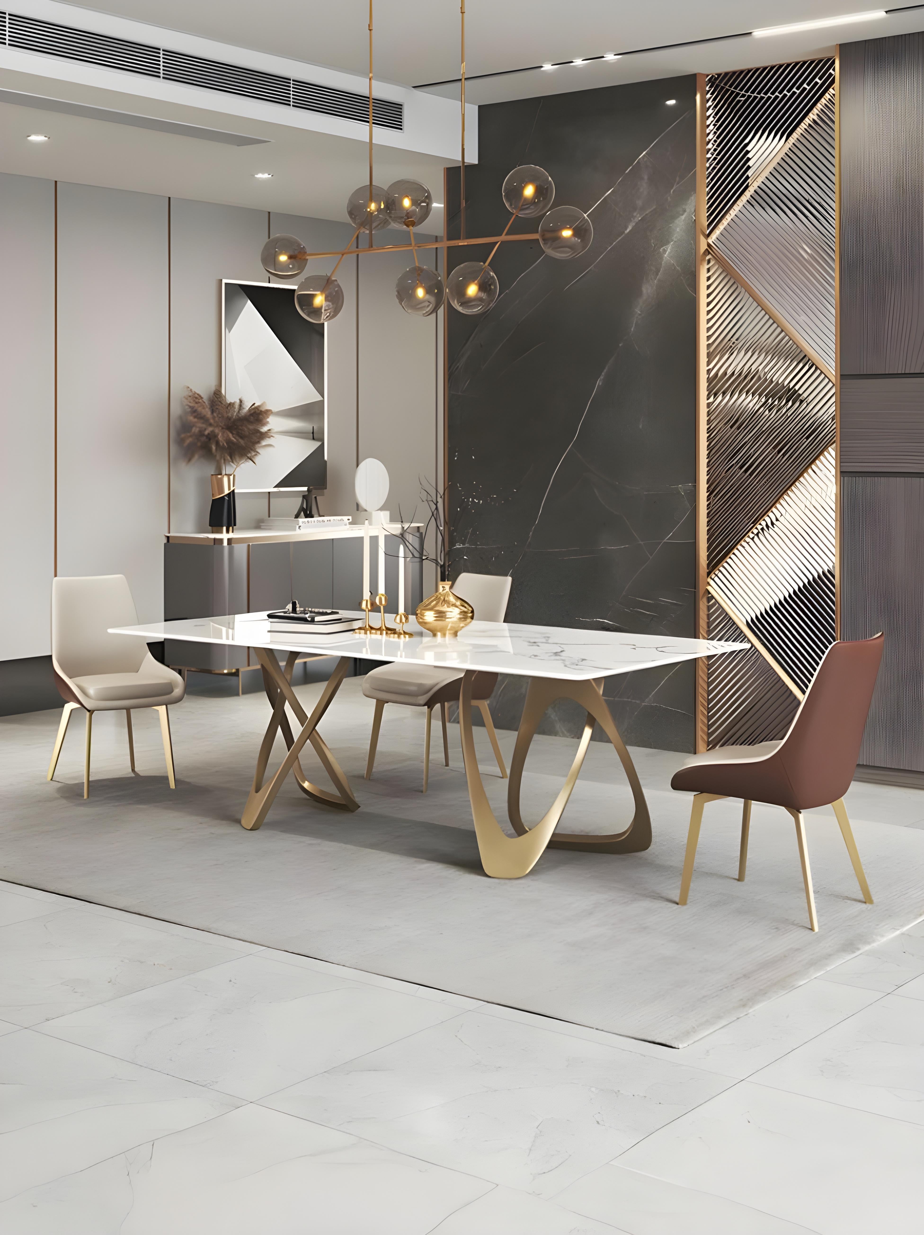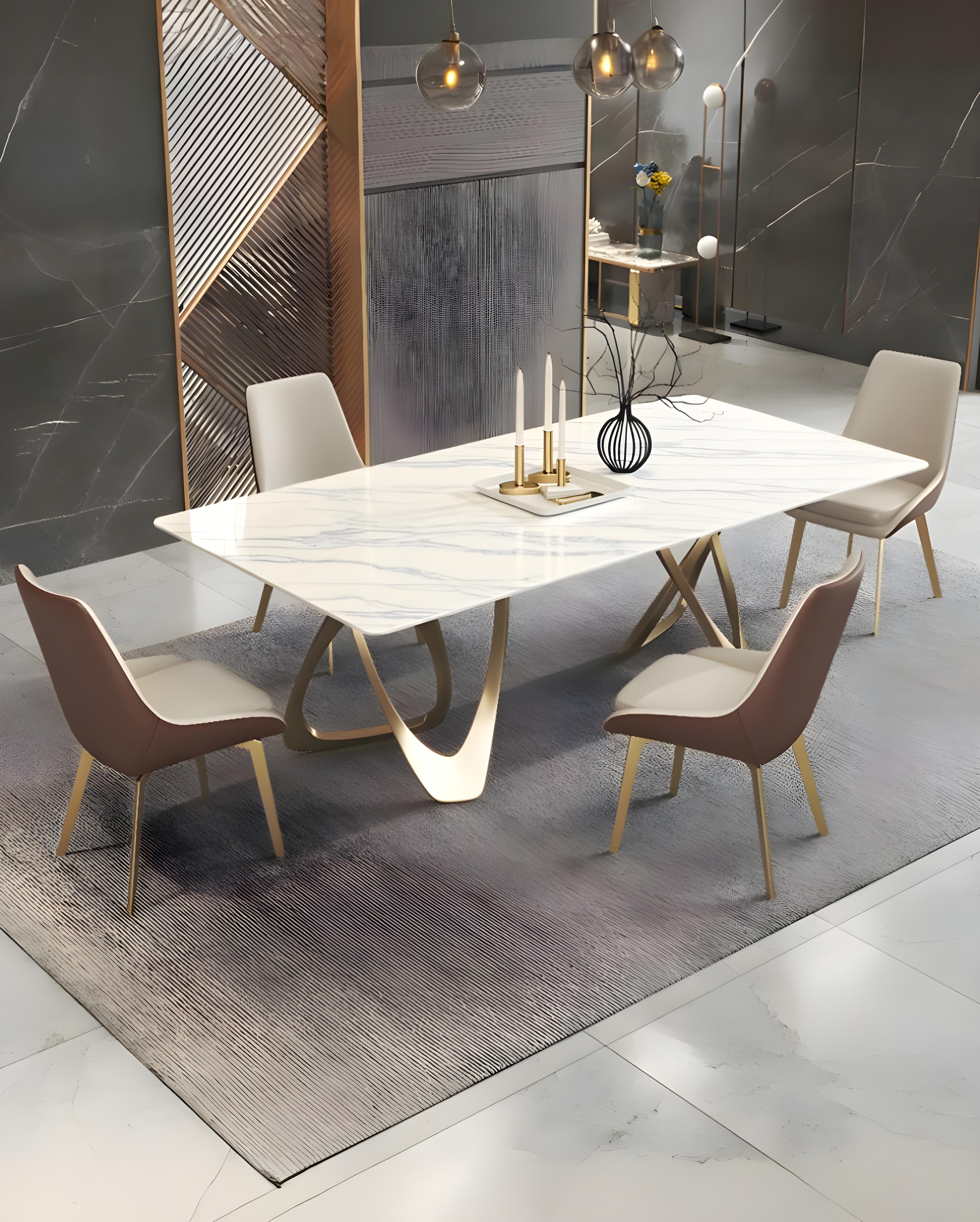 This is a contemporary 8-seater dining set designed to be a focal point in your dining room. The table features a sleek stainless steel base with a distinctive design, providing both stability and a modern aesthetic. The tabletop is made of composite marble, showcasing a beautiful blend of white and grey patterns that add a touch of luxury. The table's dimensions are 78 inches in length and 36 inches in width, offering ample space for comfortable dining. The table height is 30 inches. Accompanying the table are eight chairs, each designed with a sturdy metal base. The chairs are upholstered in a stylish two-tone combination of brown and off-white fabric, creating a warm and inviting seating arrangement. The overall design of the set combines clean lines with contrasting materials, resulting in a unique and elegant dining experience.